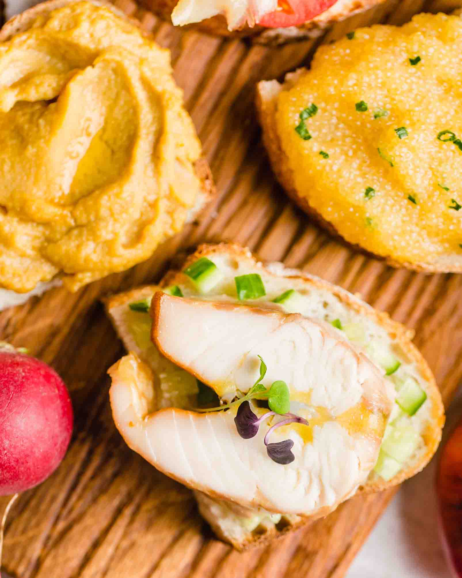 Угощение для душевной трапезы: нарезка горячего копчения — сытное мясо с упругой текстурой и удивительно многогранным ароматом копчения на буковой щепе, осётр в масле, — сочный и насыщенный, с сохранённой пользой и вкусом, для ваших гастрономических экспериментов. И, конечно, икра щуки — зернистая, солоноватая, насыщенная по вкусу и словно наполненная солнечным светом.