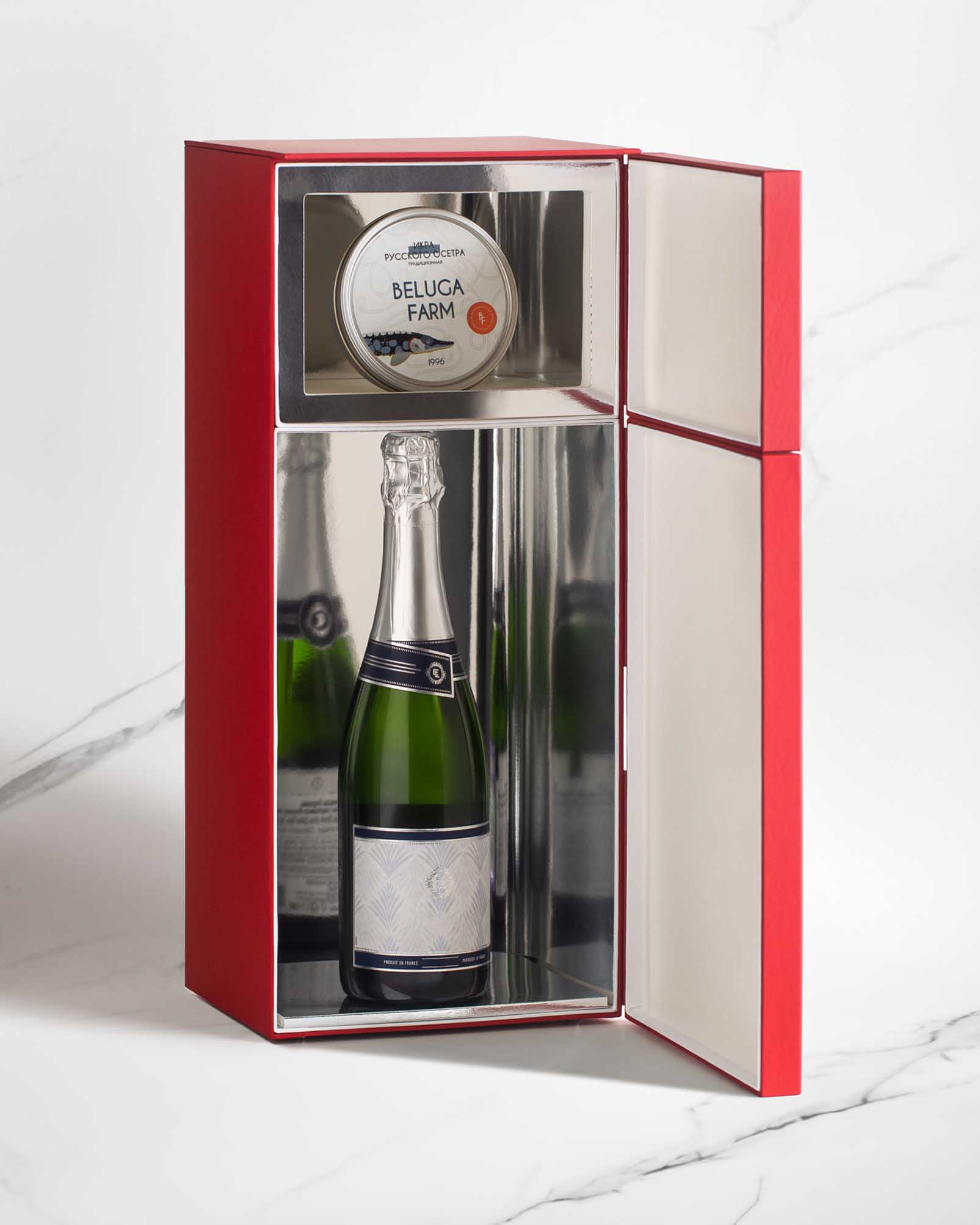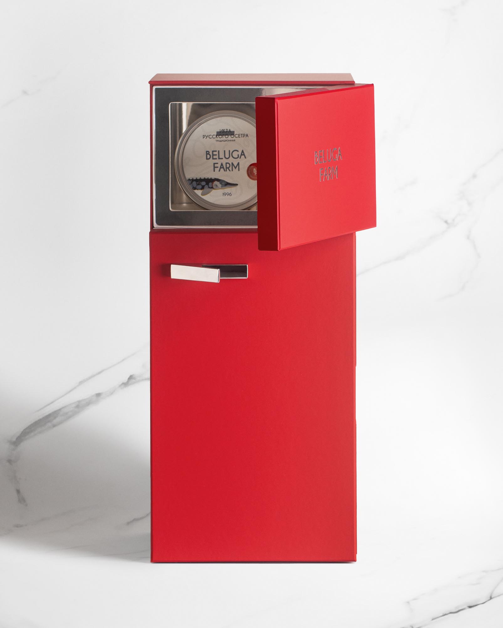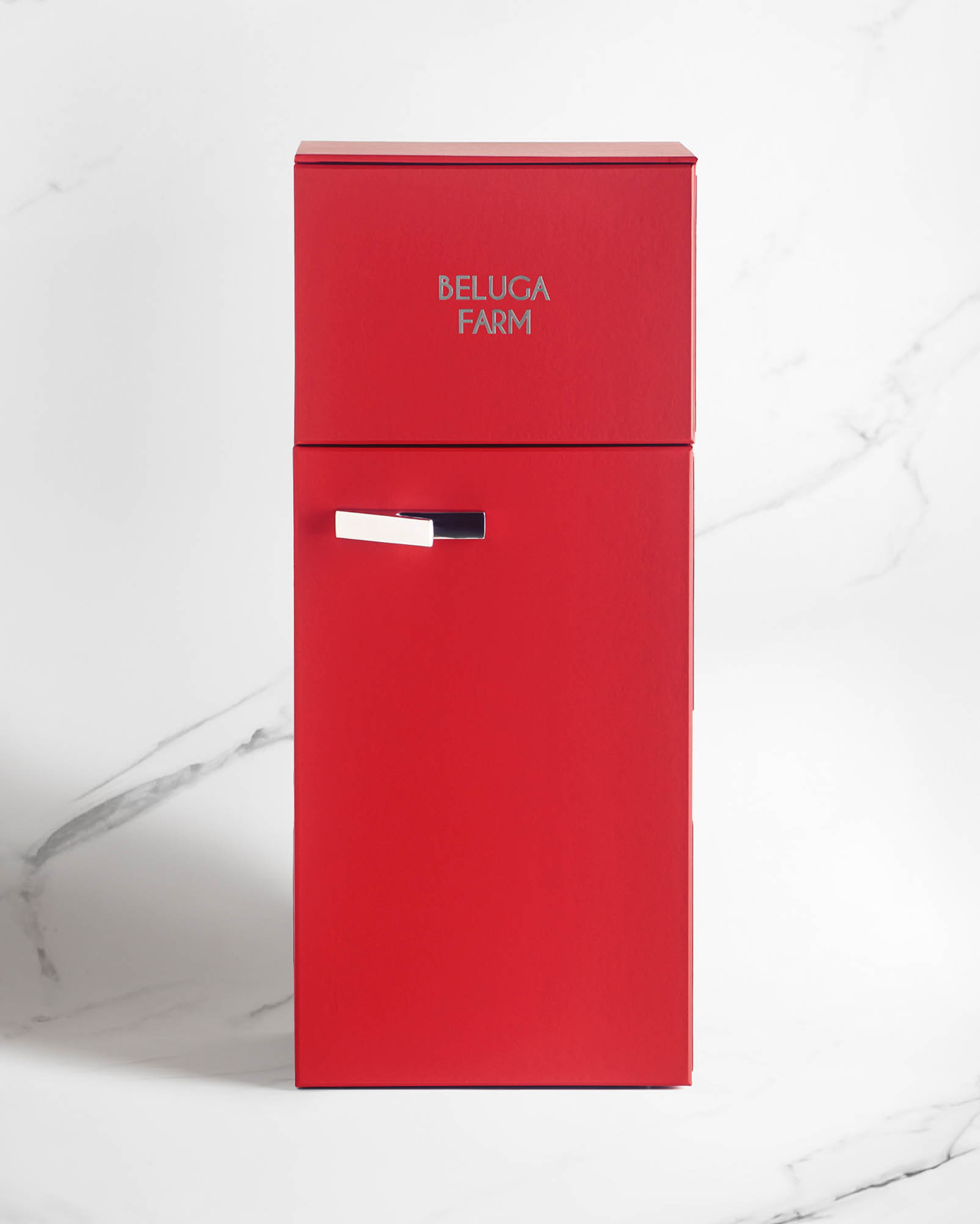 Самый необычный подарок в коллекции Beluga Farm. Создавая и совершенствуя его, мы вкладывали в этот процесс всю свою любовь к вам и самые лучшие эмоции. Миниатюрный короб-холодильник создаётся вручную, у него самые настоящие дверцы и стеклянные полки. Внутри – вкуснейшая чёрная икра, а также место под напиток, который вы выбираете дополнительно.