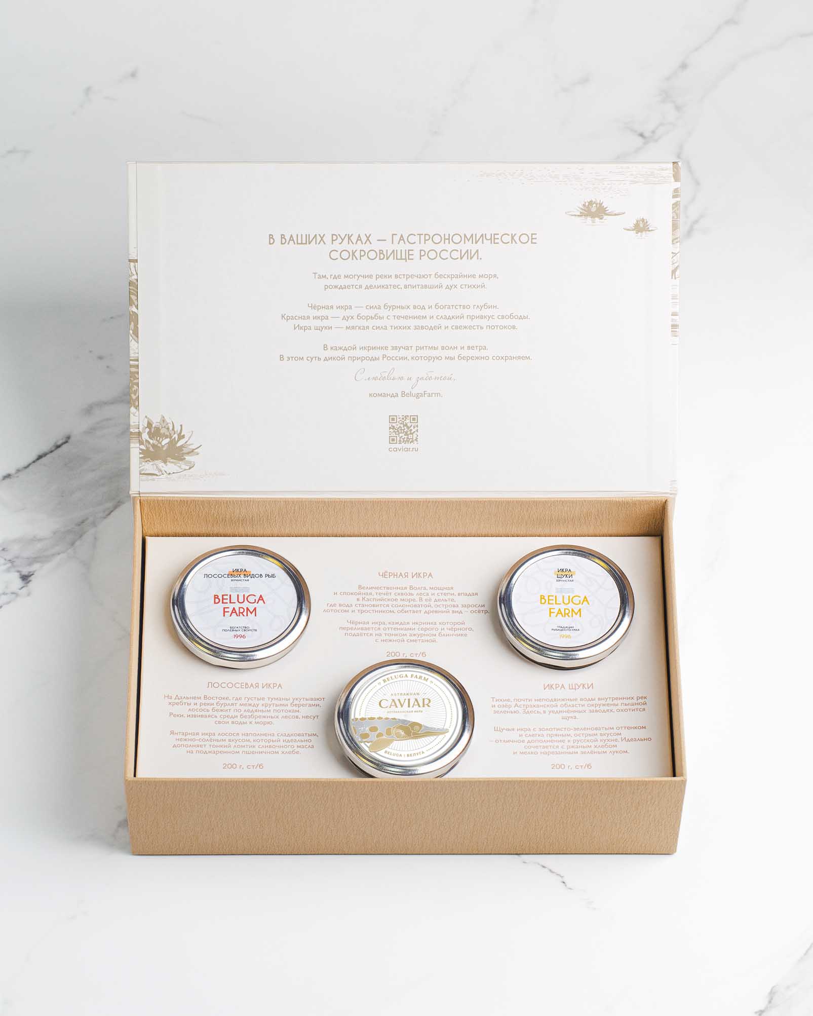 Подарочный набор, объединивший в себе удивительные фантазии природы, – чёрную, красную и щучью икру. Погрузитесь в исключительные вкусы деликатеса и прочувствуйте всю его многогранность.