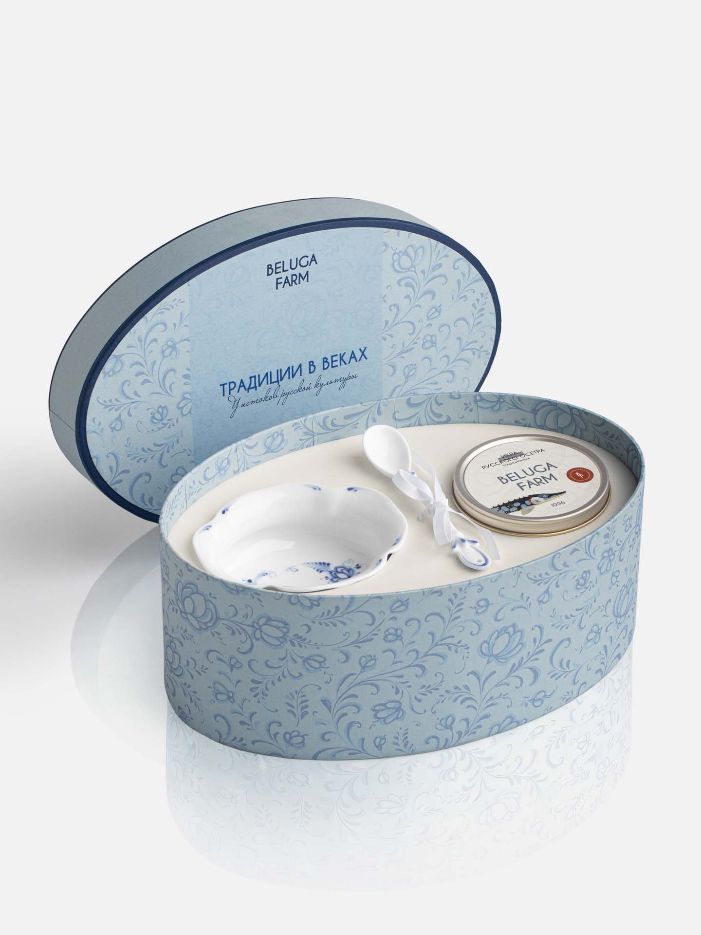 Подарочный набор «Традиции в веках» с икрой 200 г Beluga Farm x Гжельский фарфор